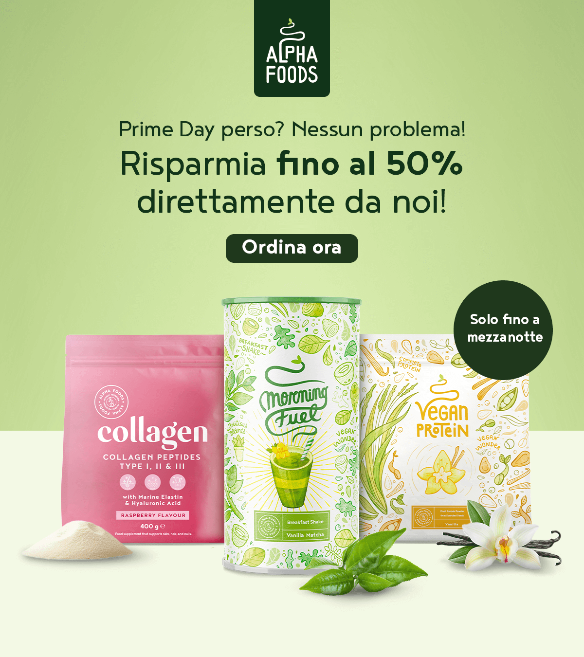 Ciao Jekoo, le ultime ore stanno per finire! Solo fino a mezzanotte puoi approfittare di tutti gli sconti del Prime Day direttamente da noi. Cogli adesso la tua ultimissima occasione e assicurati i tuoi Alpha Foods preferiti con fino al 40% di sconto! Per una versione migliore di te. |