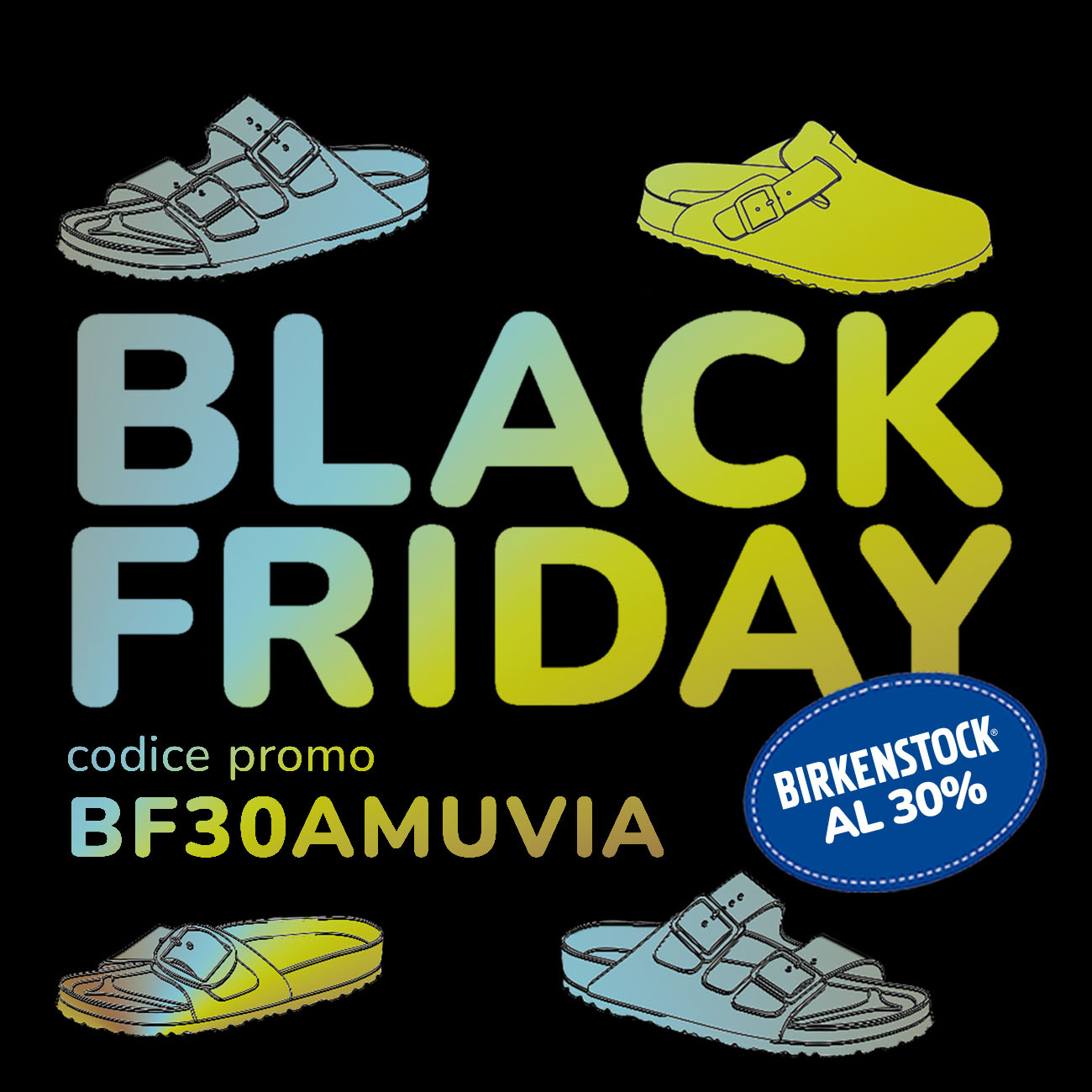 -30% sui modelli Birkenstock selezionati con il codice BF30AMUVIA.