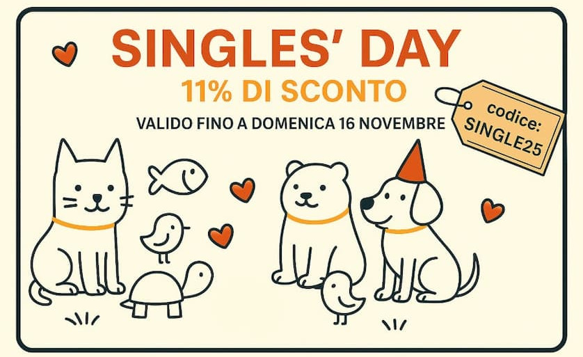 * Codice Sconto valido fino a domenica 16 novembre, esclusi prodotti Natural Code e VetLine, utilizzando il codice SINGLE25 una sola volta per cliente, su un ordine minimo di €89.