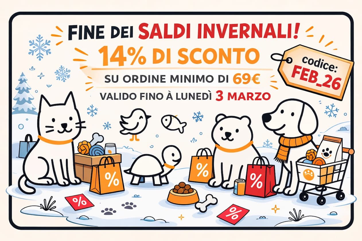 * Codice Sconto valido fino a lunedì 3 marzo, esclusi prodotti Natural Code e VetLine, utilizzando il codice FEB_26 una sola volta per cliente, su un ordine minimo di 69€.