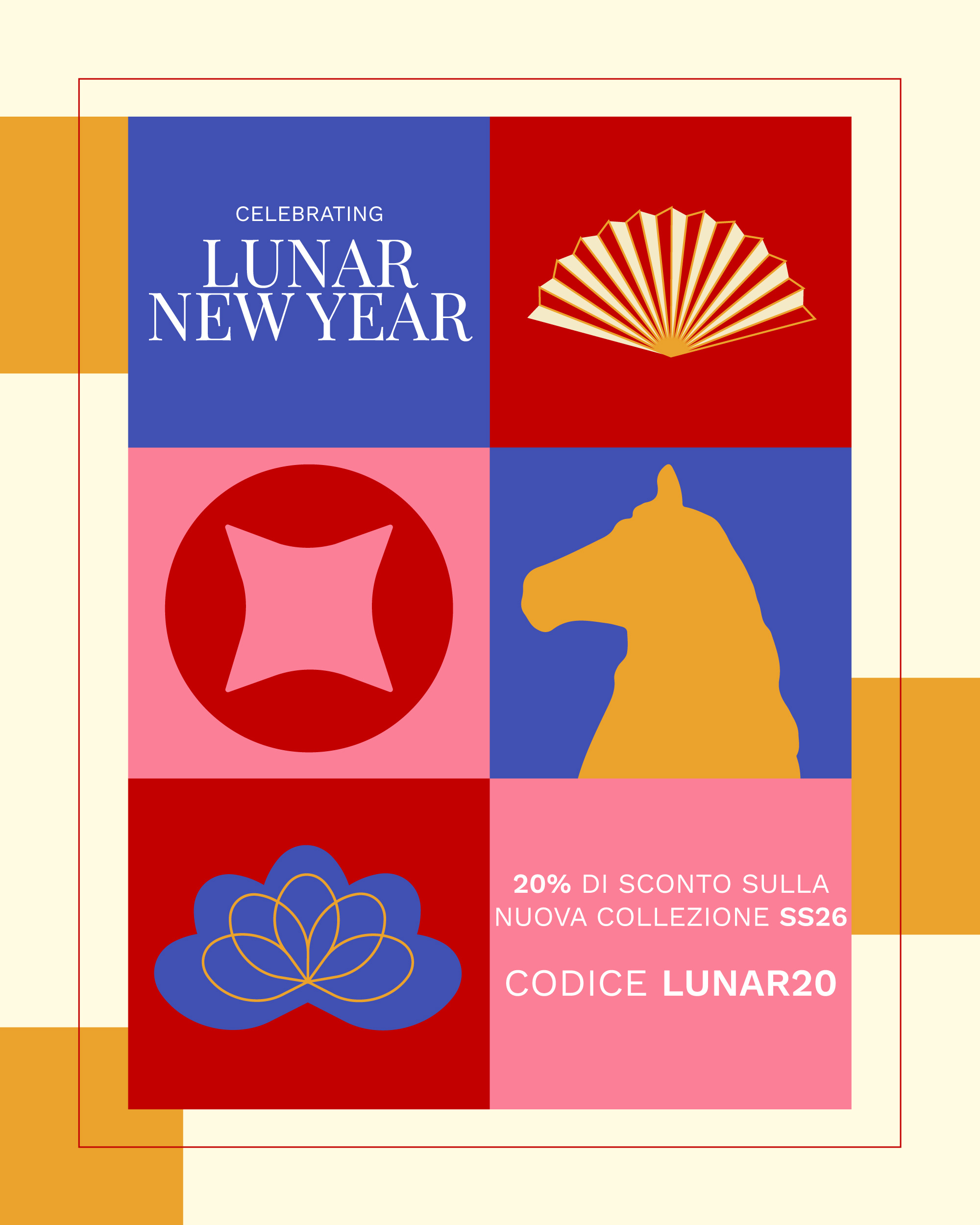 *La promozione è valida esclusivamente su una selezione di prodotti della stagione SS26, fino alle ore 23:59:59 del 17/02/2026, solo sul nostro store online. Non è cumulabile con altri coupon e non si applica ai prodotti in saldo di stagioni diverse. Alcuni prodotti carryover e alcuni brand potrebbero essere esclusi dalla promozione. Per avere lo sconto inserisci il prodotto a carrello e ultima l'acquisto inserendo il coupon LUNAR20.