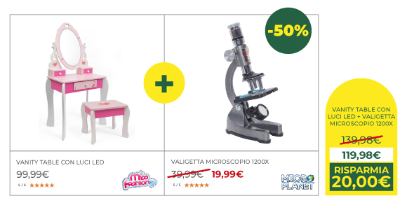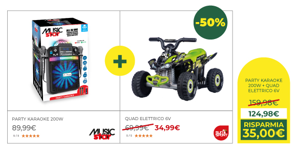 *Acquistando 2 giocattoli, con scontrino o ordine unico, il meno caro lo paghi la metà. Sono esclusi dalla promozione i prodotti già scontati, gli articoli scuola, Pokémon Gamevision, Lorcana e altre esclusioni presenti nel regolamento disponibile al box informazioni del punto vendita e su toyscenter.it.