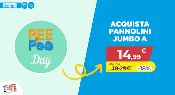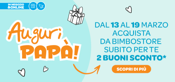 *VALIDI DAL 20 MARZO AL 5 APRILE 2026. Acquistando qualsiasi prodotto dell’assortimento Bimbostore, esclusi latti 1 e speciali, dal 13 al 19 Marzo il cliente riceve due buoni utilizzabili dal 20 marzo al 5 aprile 2026: 1 buono di 20€ su una spesa di almeno 100€ valido per l'acquisto di: sistemi modulari, passeggini, seggiolini auto, marsupi, fasce, lettini, culle, box, materassi, sdraiette, altalene, girelli, seggioloni, rialzi ecc... e 1 buono 3x2 valido per l'acquisto di: succhietti, biberon, accessori pappa, cosmesi mamma e bimbo, elettrici ecc.. Sono esclusi dall’utilizzo dei buoni: prodotti in promo, pannolini, salviette Pampers, salviette Chicco 60 pz, cuscino Elysia di Inglesina e suo rivestimento, babyfood, libri, videogiochi, Claire’s, Legami, Gift Card, kit risparmio, una selezione di articoli puericultura pesante e l'assortimento completo Toys Center. Per scoprire le esclusioni di puericultura in negozio consulta il regolamento in cassa oppure online al link www.bimbostore.com./esclusioni/. I buoni sconto verranno stampati a scontrino in negozio mentre per gli acquisti online verranno inviati via email al cliente che ha effettuato l’acquisto online di almeno un prodotto dell'assortimento Bimbostore, due buoni per ogni ordine. Offerta riservata ai titolari di Fidelity Card.
