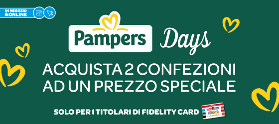 Offerta riservata ai titolari di Fidelity Card valida nei negozi aderenti all’iniziativa. Durante la giornata di sabato 14 febbraio l’attività è valida utilizzando un buono sconto distribuito da promoter per l’acquisto di 2 confezioni di Quadri Progressi Tradizionali o Quadri Progressi Mutandino, 2 confezioni di Penta Baby Dry Tradizionale o Penta Baby Dry Mutandino, 2 confezioni di Salviette Baby Fresh 500pz, 2 confezioni di salviettine esa sensitive 378 pz. Dove non presente la promoter, lo sconto sarà attivo direttamente in cassa. Durante la giornata di domenica 15 febbraio l’attività sarà gestita senza la promoter. L’offerta è valida fino ad esaurimento scorte. Al fine di garantire la disponibilità dell’offerta al maggior numero di clienti, la quantità massima acquistabile è n.2 pezzi.
