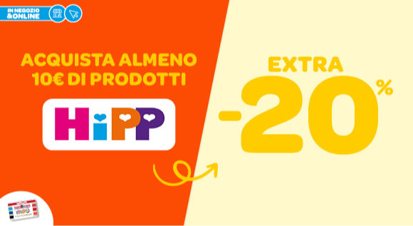 Sconto extra 20% su tutti i prodotti Hipp baby food (esclusi latti 1 e speciali) all’acquisto di almeno 10€ di prodotti Hipp baby food.