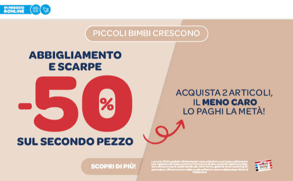 Lo sconto 50% è applicato direttamente in cassa sull’articolo con il prezzo più basso tra i due registrati sullo stesso scontrino. Promozione valida su acquisti multipli di prodotto. Sono esclusi accessori, tessile letto&culla, intimo bimbo, gestante e tutti i prodotti già in promozione. Offerta non cumulabile con altre offerte in corso e valida solo per titolari di Fidelity Card.