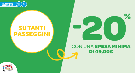 Lo sconto 20% viene applicato al raggiungimento della soglia di 49 euro. Sono esclusi dalla promozione i passeggini Aero-we, Taormina, Goody XPlus, Dolomiti e New Echo di Chicco collezione 2025, i passeggini Balios s Lux, Libelle e Beezy di Cybex collezione 2025, i passeggini Maior, Quid3, Sketch e Aptica XT di Inglesina collezione 2025, passeggini Volo Perego e accessori. Promozione non è cumulabile con altre promozioni. Offerta riservata ai titolari di Fidelity Card valida nei negozi aderenti all’iniziativa.