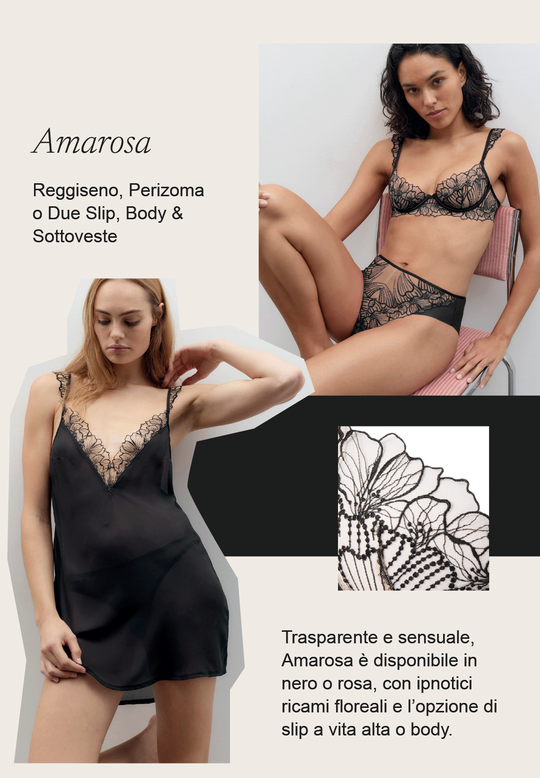 La nostra ultima collezione presenta una fresca palette di tonalità pastello, azzurro ghiaccio e rosa perla che illuminano la pelle, insieme ai classici bianco e nero. Realizzata in tessuti ultra leggeri, la collezione è impreziosita da ricami floreali fluidi, dettagliati e ipnotici, pensati per adornare il tuo corpo.