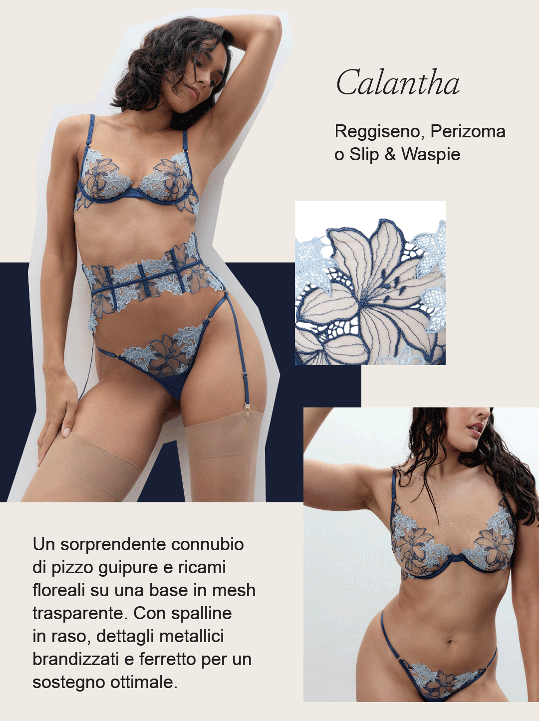 La nostra ultima collezione presenta una fresca palette di tonalità pastello, azzurro ghiaccio e rosa perla che illuminano la pelle, insieme ai classici bianco e nero. Realizzata in tessuti ultra leggeri, la collezione è impreziosita da ricami floreali fluidi, dettagliati e ipnotici, pensati per adornare il tuo corpo.