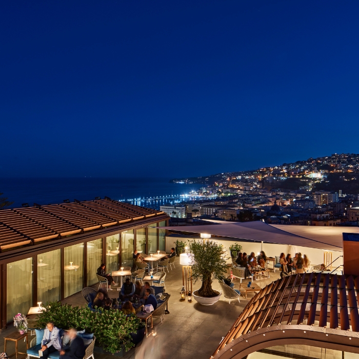 Il Niq Bar è l’elegante rooftop dell’hotel De Bonart Naples, dal quale si domina la città con un panorama mozzafiato sul Golfo di Napoli. Un luogo perfetto per godersi un emozionante tramonto sul mare o una fresca serata sotto le stelle. |