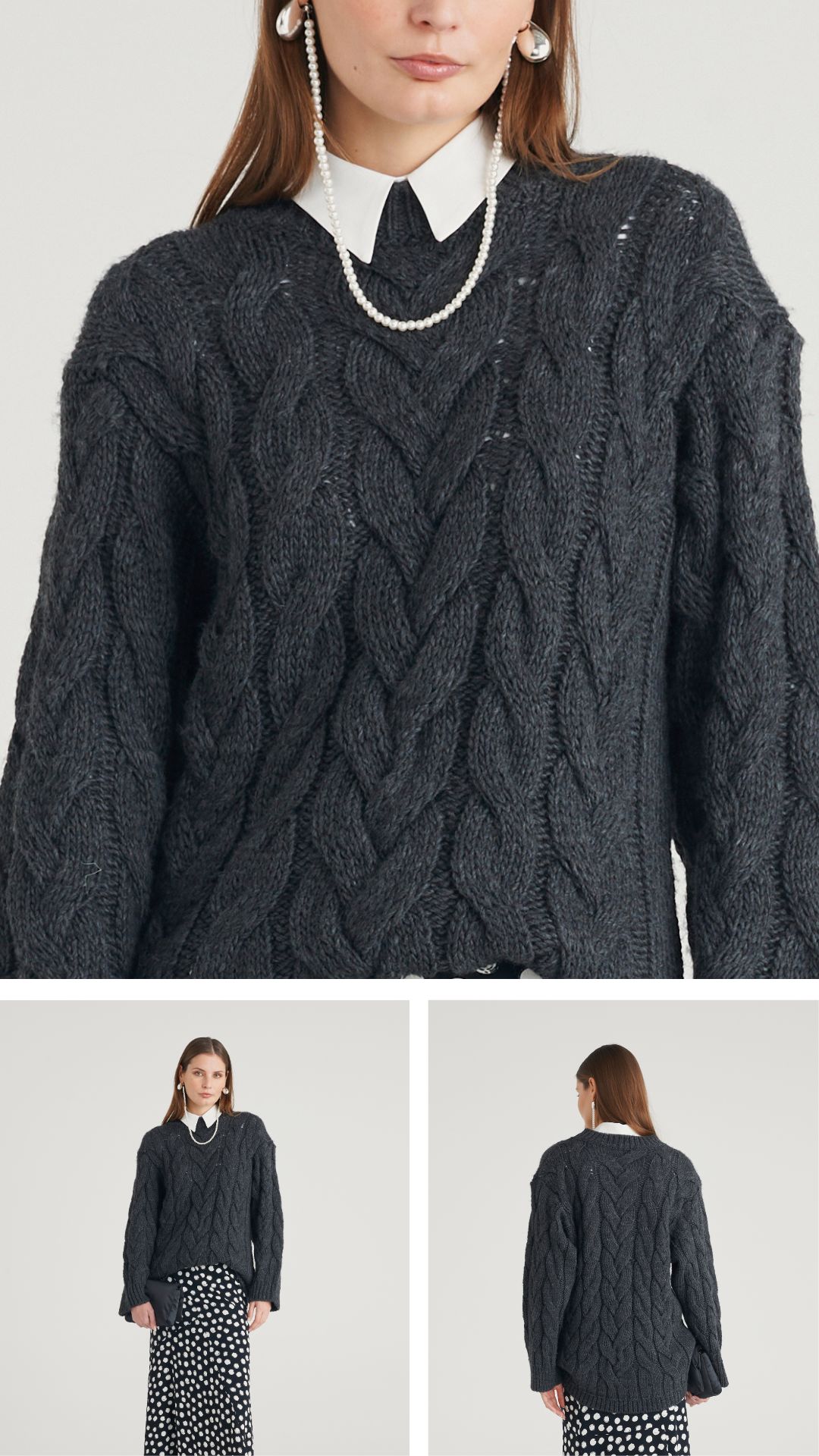 Un maxi pull intrecciato dal gusto accogliente incontra la leggerezza di una gonna midi a pois, per un look che sa essere raffinato ma anche sorprendentemente deciso! |