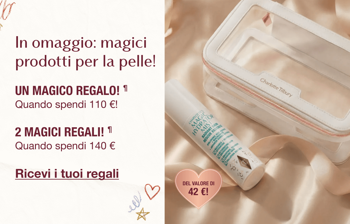 ¶Spendi l'importo qualificante (come segue) in un'unica transazione su www.charlottetilbury.com, sull'app (Importo Qualificante) oppure nei negozi Charlotte Tilbury Beauty selezionati nel Regno Unito e ricevi i regali corrispondenti. Livello 1: spendi oltre 110 € e ricevi uno spray Charlotte's Magic Hydrator Mist gratuito (75 ml). Livello 2: spendi oltre 140 € e ricevi un Charlotte’s Magic Hydrator Mist (75 ml) e una trousse in regalo. Fino a esaurimento scorte. L'acquisto di carte regalo, consulenze, abbonamenti, le spese di spedizione e le confezioni regalo non sono inclusi nell'Importo Qualificante. Per conoscere i Termini e condizioni completi, vedi i Termini e condizioni di Prodotto in regalo con promozioni di acquisto.