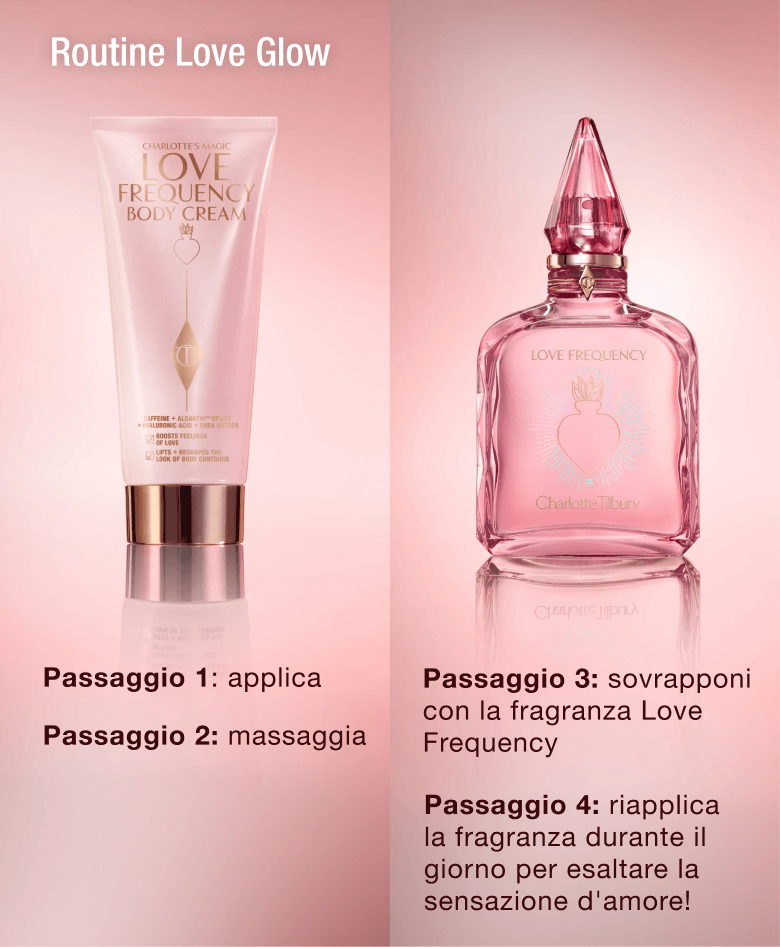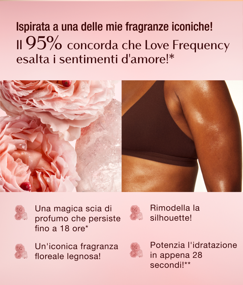 Combinando gli effetti idratanti e leviganti della mia originale, premiata Magic Body Cream e l'iconica fragranza floreale legnosa del mio profumo Love Frequency, la NUOVA Magic Love Frequency Body Cream è una crema corpo che ravviva immediatamente la pelle ed esalta i sentimenti d'amore ogni volta che la indossi! |
