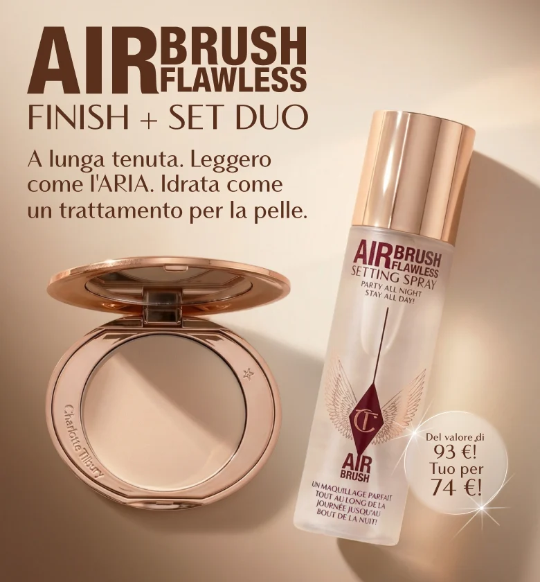 Darling, fissa il tuo look fino a 16 ore** con AIRbrush Flawless Setting Spray, lo spray fissante resistente all'acqua clinicamente testato, e l'impalpabile cipria AIRbrush Flawless Finish! Sono a lunga tenuta, leggeri come l'ARIA e idratano come prodotti per la cura della pelle! |