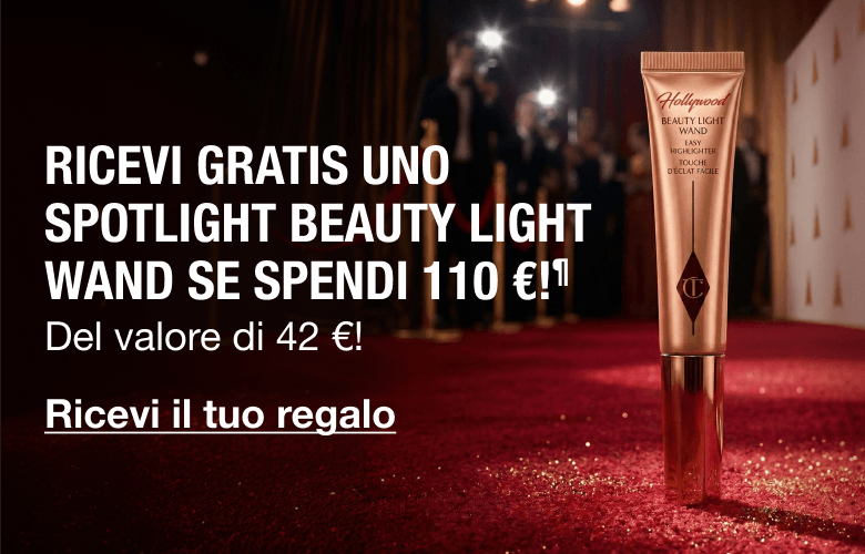 ¶Ricevi gratis un Beauty Light Wand nella tonalità Spotlight quando spendi oltre 110 € in un'unica transazione su CharlotteTilbury.com o sull'app (Importo Qualificante). Fino a esaurimento scorte. Termina alle 05:59 CET del 20 marzo 2026. L'acquisto di carte regalo, consulenze, abbonamenti, le spese di spedizione e le confezioni regalo non sono inclusi nell'Importo Qualificante. Per conoscere i Termini e condizioni completi, vedi i Termini e condizioni di "Prodotto in regalo con promozioni di acquisto".