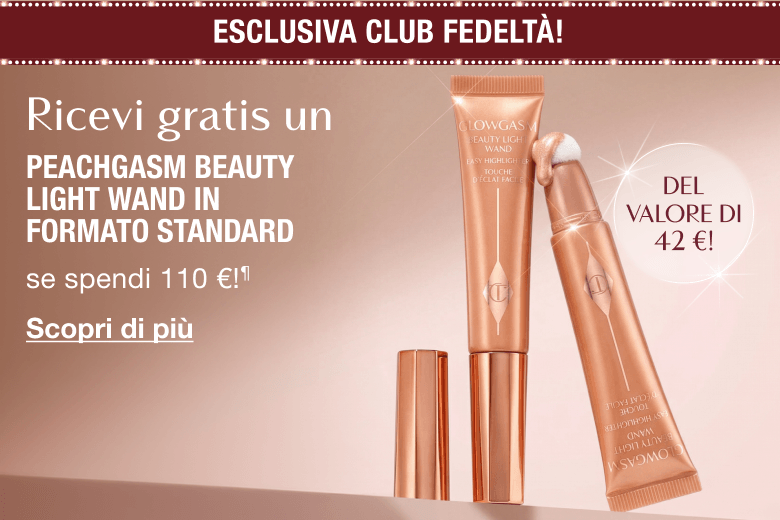 ¶Ricevi un Peachgasm Beauty Light Wand gratis quando spendi oltre 110 € in un'unica transazione su www.charlottetilbury.com o sull'App (Importo Qualificante). Fino a esaurimento scorte. Termina alle 05:59 CEST di mercoledì 15 aprile 2026. L'acquisto di carte regalo, consulenze, abbonamenti, le spese di spedizione e le confezioni regalo non sono inclusi nell'Importo Qualificante. Per i Termini e condizioni completi, consulta i Termini e condizioni di "Prodotto in regalo con promozioni di acquisto". I clienti devono far parte del Club Fedeltà Charlotte’s Darlings e aver effettuato l'accesso al proprio account per usufruire di questa offerta. Per maggiori informazioni, si prega di consultare i Termini e condizioni del Club Fedeltà di Charlotte.