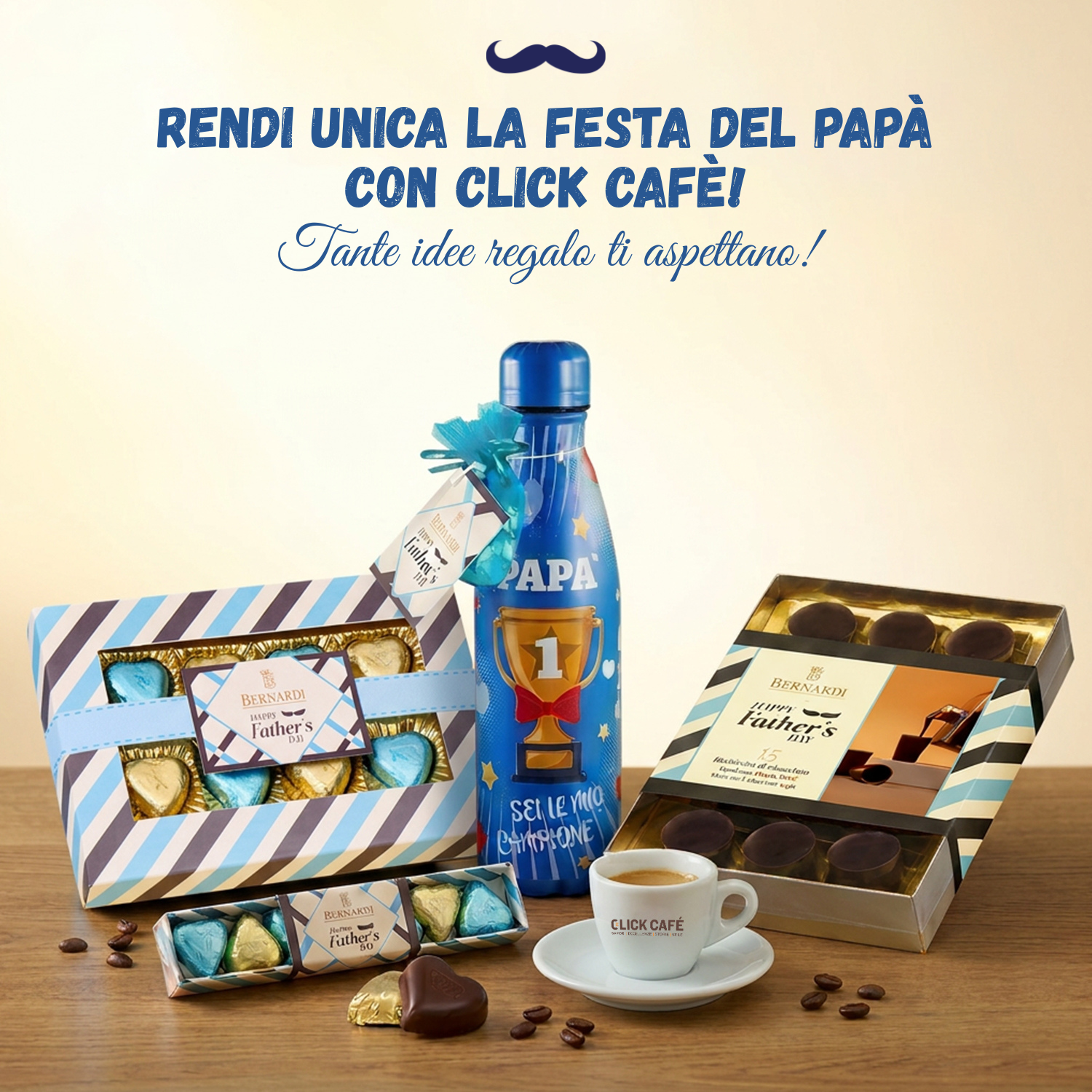 Su Click Cafè trovi tante idee regalo perfette per la Festa del Papà: caffè pregiati, dolci artigianali, accessori per la pausa caffè e tante sorprese da gustare o regalare.