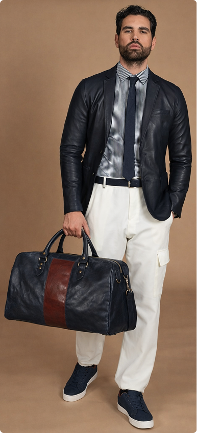 Per lui: il blazer che valorizza Il blazer Luke in pelle di agnello blu si abbina facilmente sia al formale che al casual. Perfetto con una camicia per il pranzo di Pasqua, funziona altrettanto bene con una polo per il giorno dopo. E se hai in programma una gita fuori porta per Pasquetta, il borsone Morris in pelle di vitello tamponata a mano è pensato per accompagnarti. Blu con dettagli marroni, struttura capiente ma linea pulita, manici robusti e tracolla regolabile. Pratico per gli spostamenti senza rinunciare allo stile.