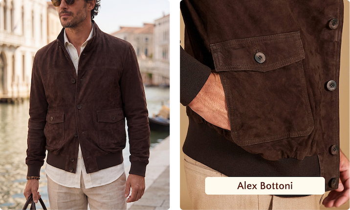 Il bomber Alex Bottoni in pelle di capra scamosciata è disponibile in testa di moro, un marrone cioccolato profondo e avvolgente. Chiusura a bottoni, collo elastico, tasche frontali con pattina, vestibilità slim. La pelle di capra scamosciata è naturalmente più robusta dell'agnello, pensata per durare stagioni. Il testa di moro è ricco senza essere pesante, perfetto quando cerchi qualcosa di strutturato ma non troppo scuro.