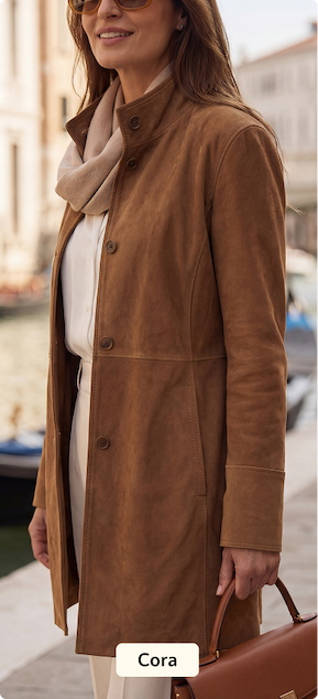 Il cappottino Cora in pelle di capra scamosciata ha taglio vivo, sfoderato con interno in nappa, bottoni discreti, una linea pulita che si porta su tutto. La pelle scamosciata agnello ha quella morbidezza delicata al tatto ma resistente nel tempo.