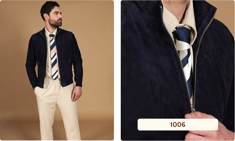 Il bomber 1006 in pelle di capra scamosciata blu è l'essenziale fatto bene. Vestibilità slim che valorizza senza costringere, collo alla coreana, dettagli come la striscia in camoscio a contrasto sui polsini che fanno la differenza. Si abbina a tutto, funziona in primavera come nelle serate fresche, migliora con l'uso invece di consumarsi.