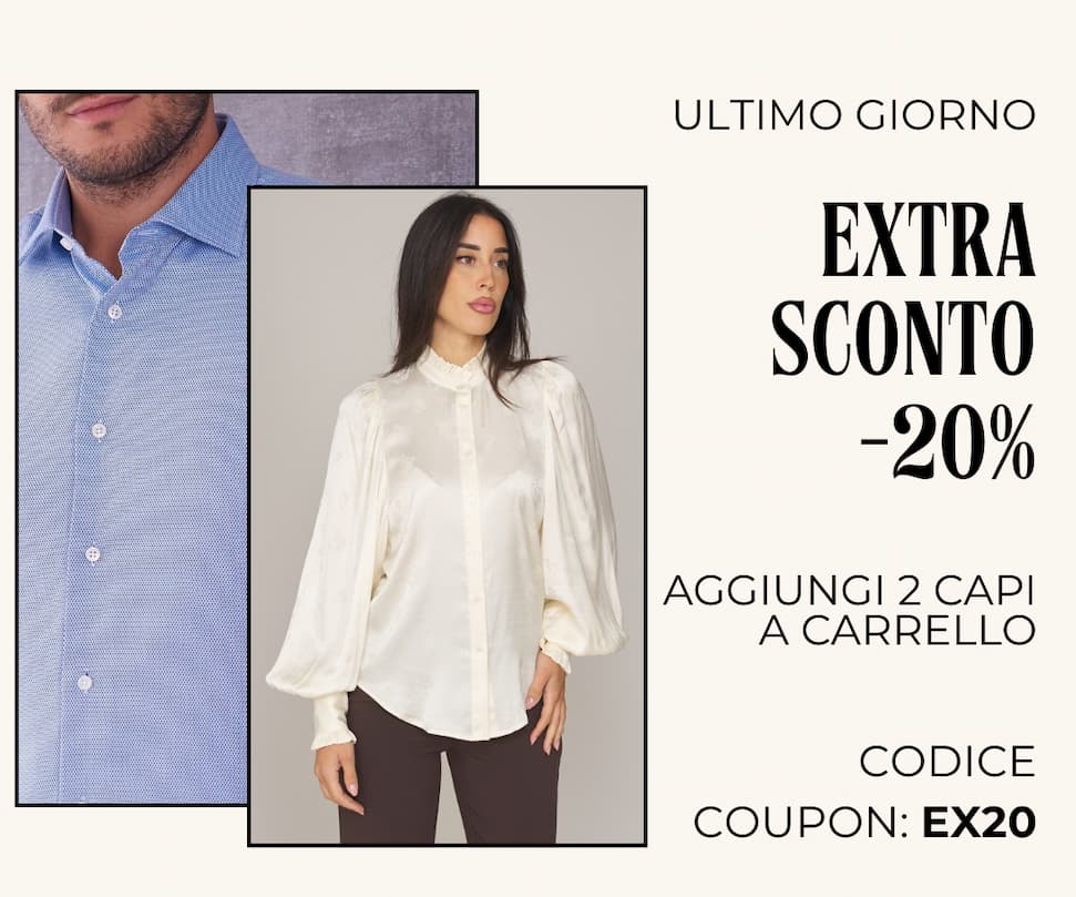 Con il codice EX20 ricevi un extra -20% sui capi già scontati, con l’acquisto di almeno due articoli.