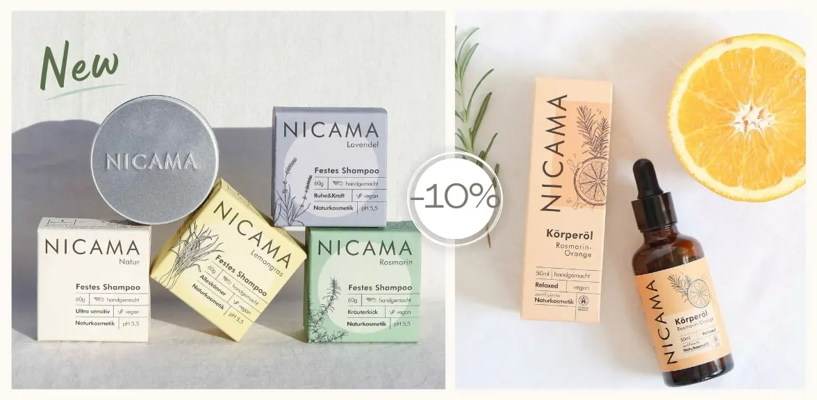 Cosmetici e saponi naturali di alta qualità, confezionati senza plastica. NICAMA si basa sulla sostenibilità, sul riciclo creativo e su materie prime pregiate: shampoo solidi, saponette, saponi esfolianti, deodoranti in crema e oli preziosi: ottieni subito il 10% di sconto sul brand.