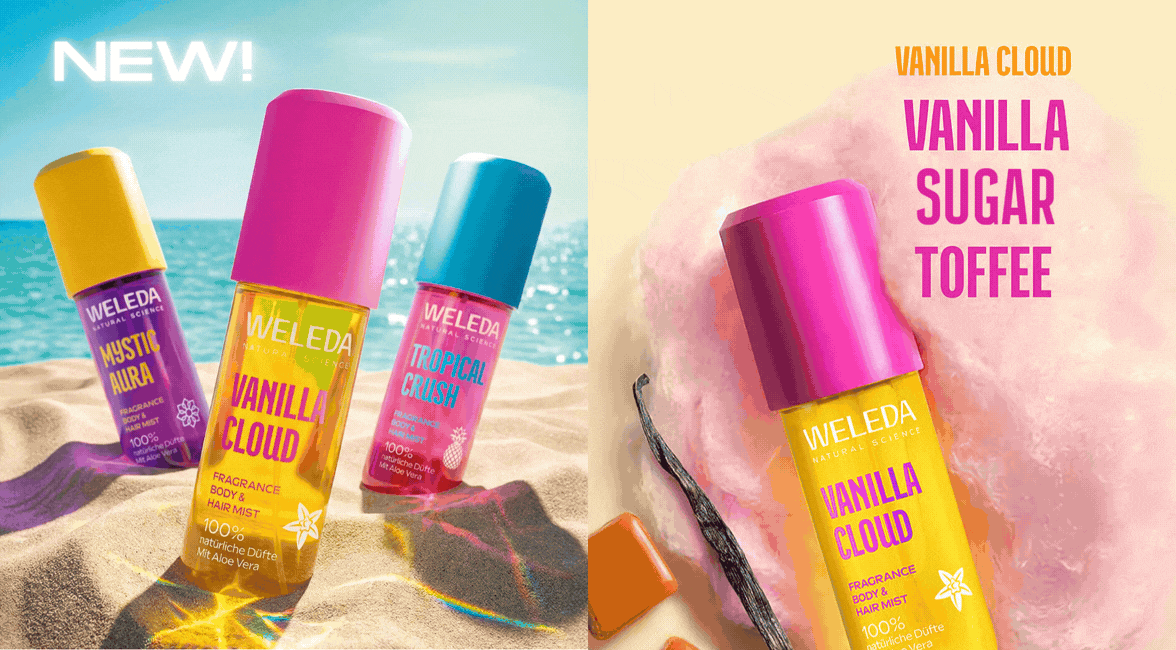 Che si tratti della fragranza legnosa e orientale Mystic Aura, della dolce Vanilla Cloud o della fruttata Tropical Crush, i nuovi Fragrance Body & Hair Mists di WELEDA ti rinfrescano con profumi 100% naturali e aloe vera rinfrescante. Mescola gli spray vegani a tuo piacimento e goditi una sferzata di freschezza estiva.