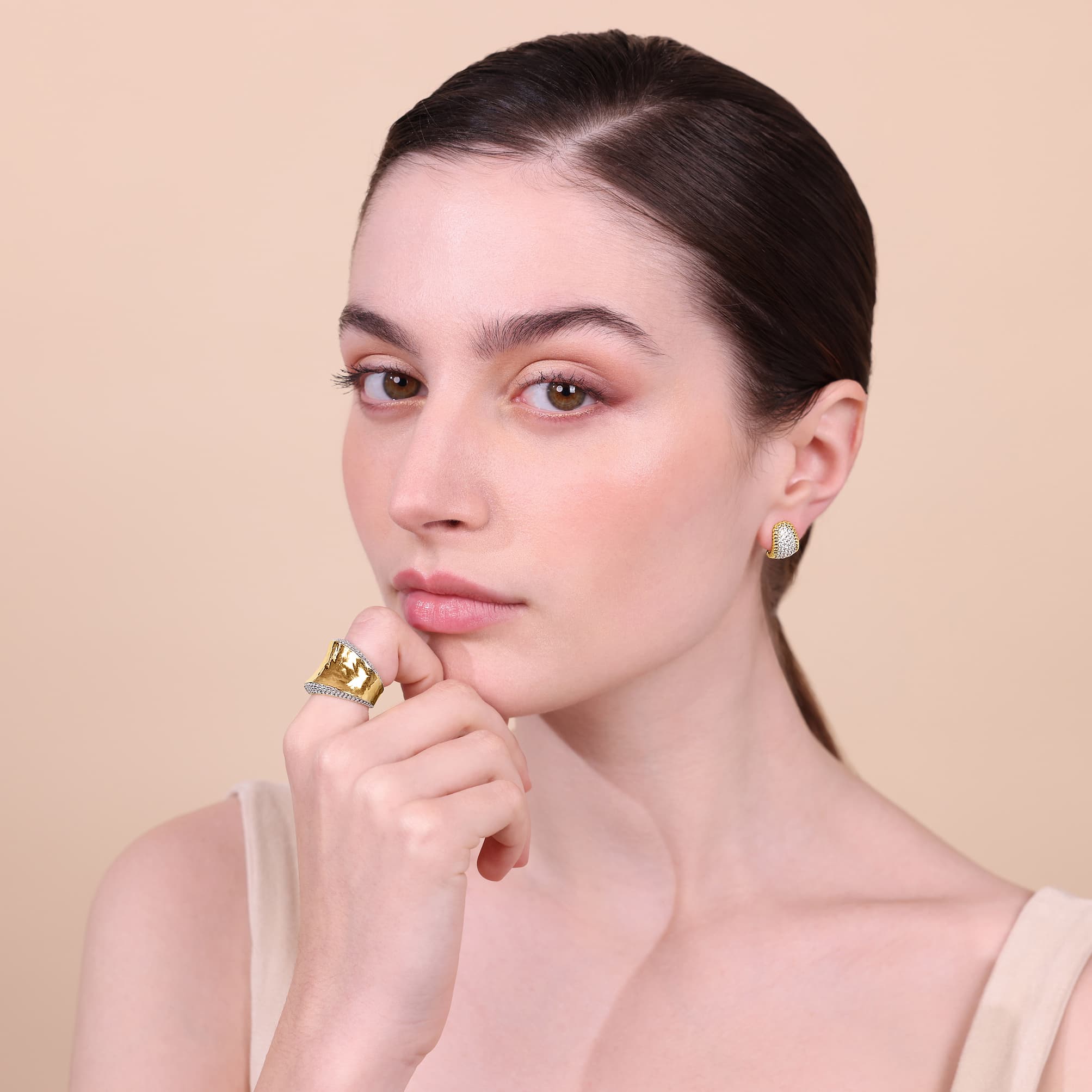 Accanto a questa, nasce un incontro ancora più bello: la combinazione tra martellato e pavé di zirconi bianchi, dove due lavorazioni si fondono per creare profondità, catturando una luminosità ancora più intensa.