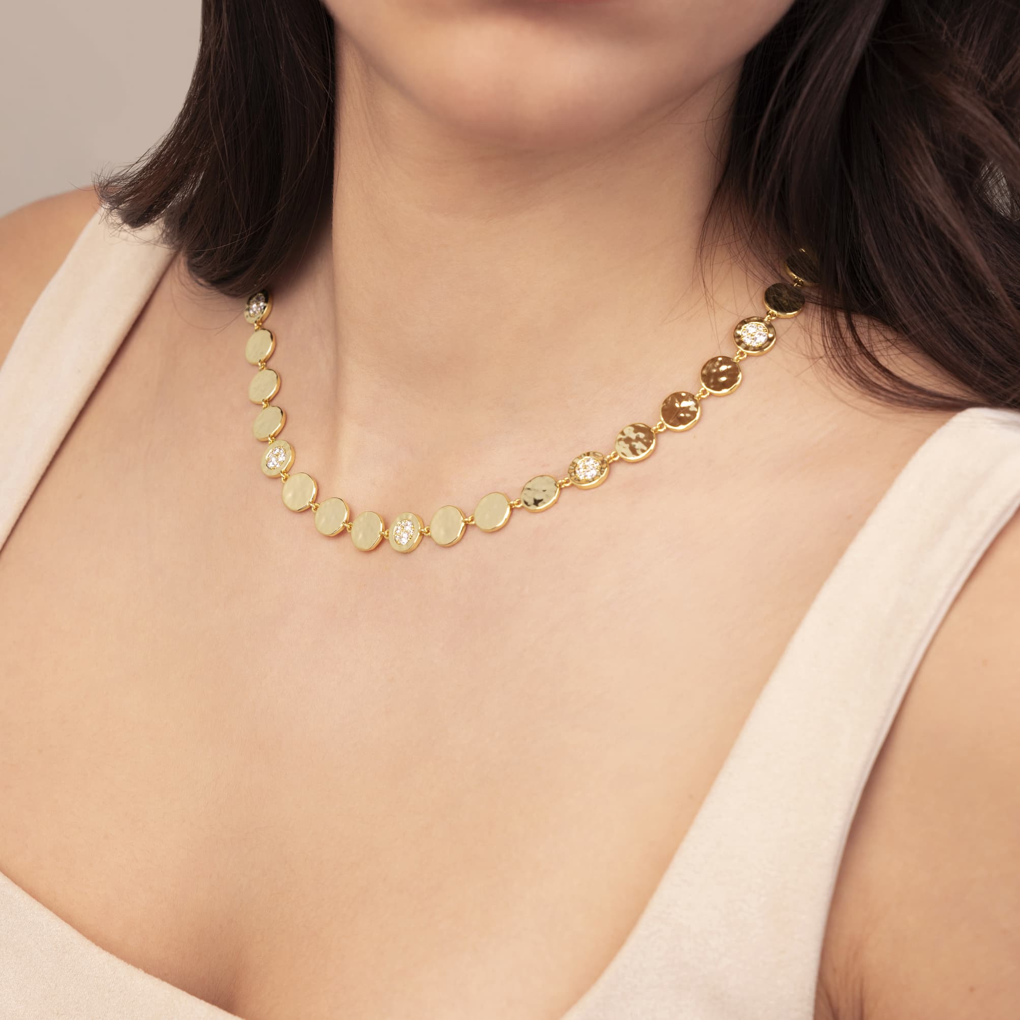 Collana Eclissi Dorata Dischi martellati alternati a pavé di zirconi bianchi