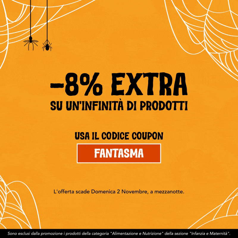 La notte più spettrale dell'anno è alle porte e un misterioso fantasma si aggira su Farmacosmo, pronto a farti un sconto da brividi! Il suo spirito aleggia sul sito, e ogni volta che passi al carrello, sussurra un codice che ti farà risparmiare… ma solo se sei veloce! La sua magia non durerà a lungo: potrai acquistare tutto ciò che desideri e fare scorta dei tuoi prodotti preferiti fino alla mezzanotte del 2 novembre. Su oltre 60.000 prodotti, ricevi subito uno SCONTO EXTRA