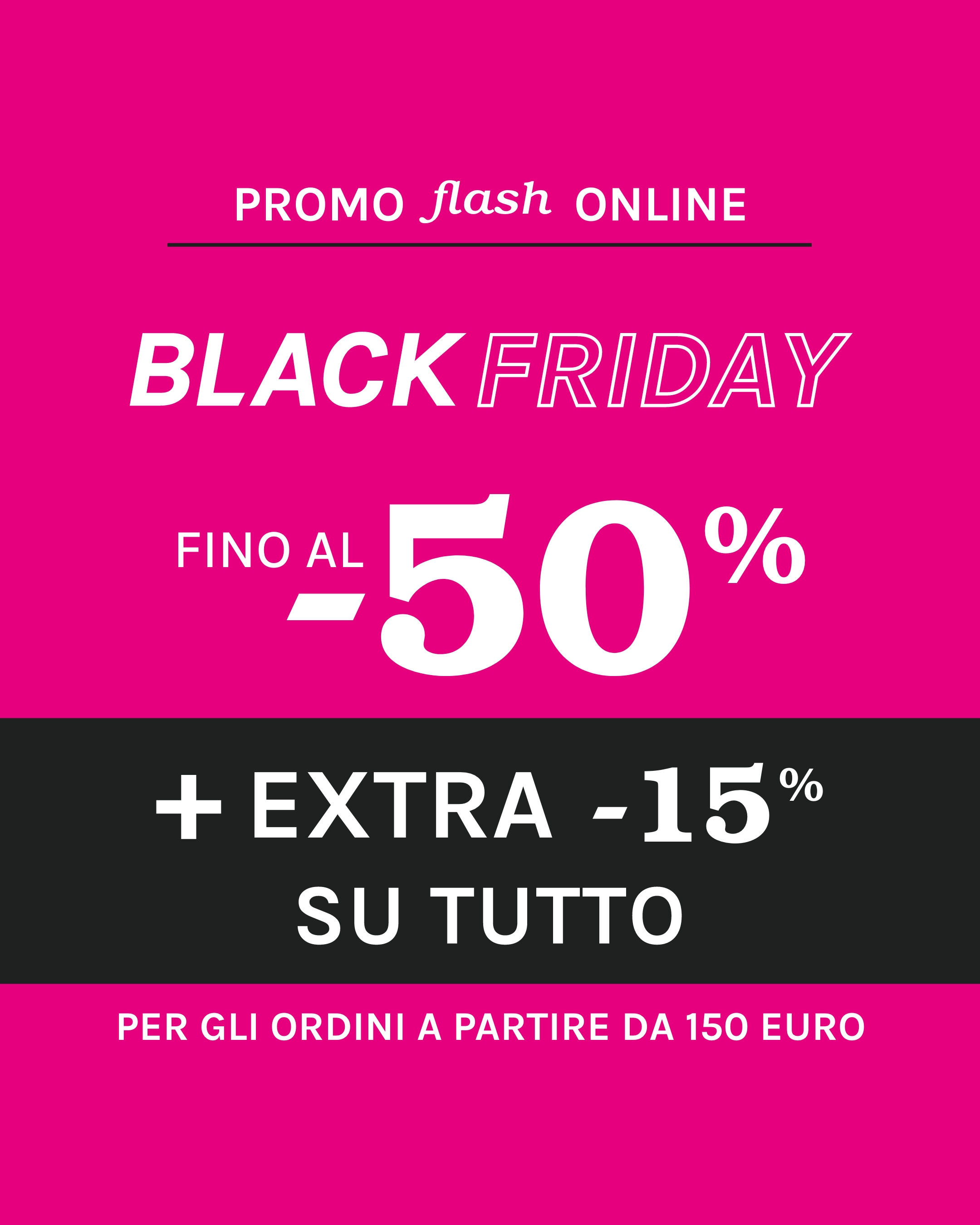 Lo sconto EXTRA -15% per ordini a partire da 150€ è valido su tutta la collezione Autunno Inverno inclusi i nuovi arrivi e scade il 26/11 alle ore 10. Lo sconto è visibile direttamente nel riepilogo dell'ordine. Lo sconto non è valido sui prodotti intimo Triumph e Cette. Gli outlet potrebbero avere un calendario promozionale differente. Fino al 17 dicembre il reso è esteso a 50 giorni.