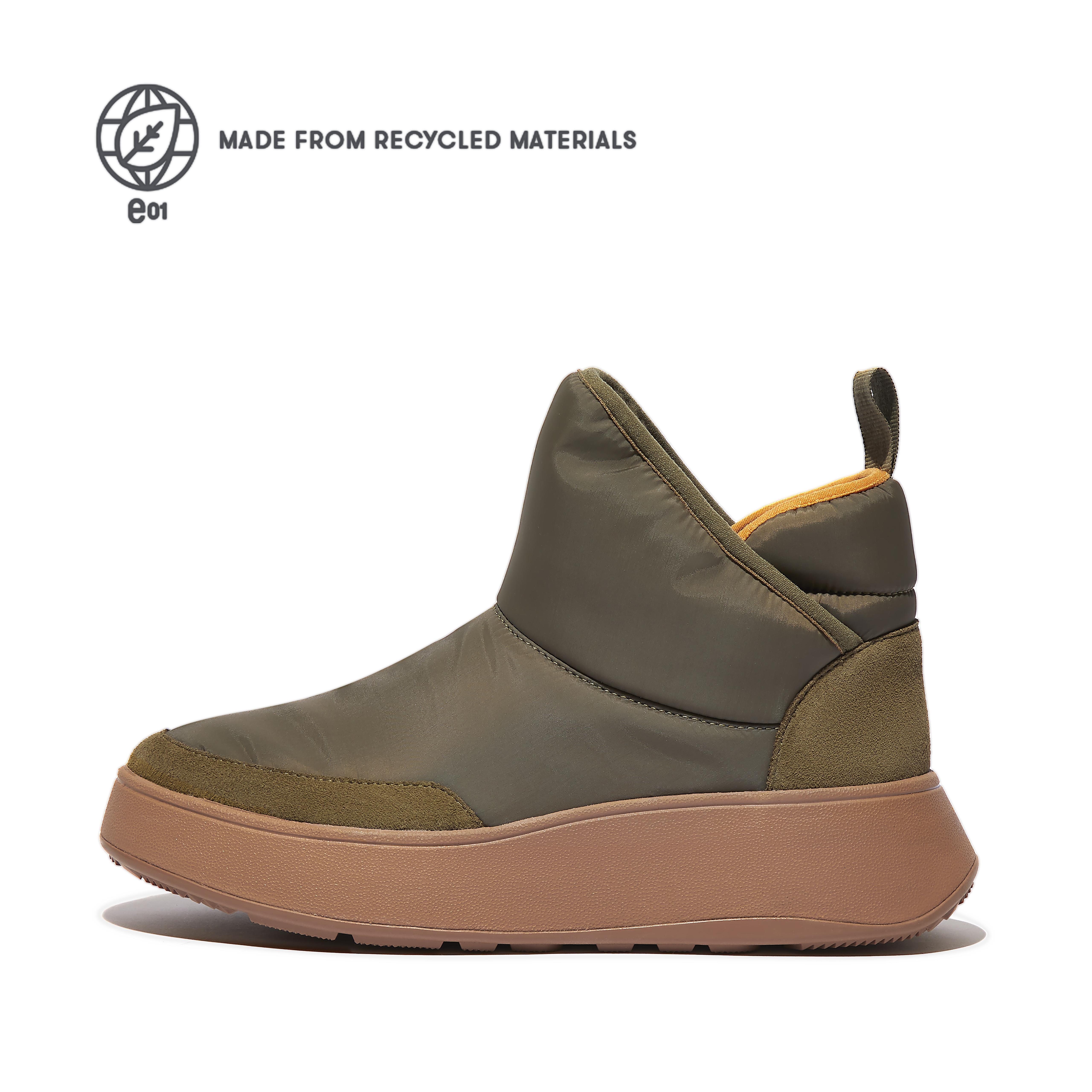 In water-resistant, non-wicking, padded nylon, lined with soft fluffy biofleece (both 50% PET recycled from plastic bottles). With pull tabs for easy on/off.