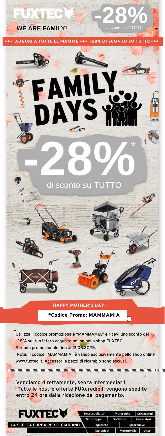 Attenzione: Il codice è valido esclusivamente sullo shop online www.fuxtec.it. Accessori e ricambi sono esclusi.