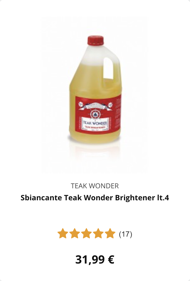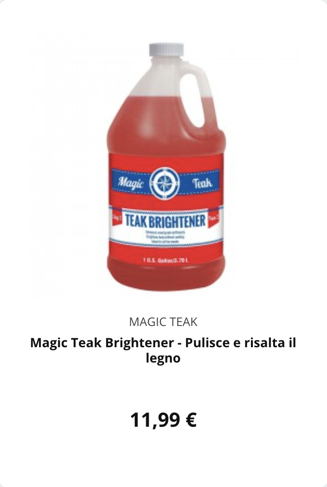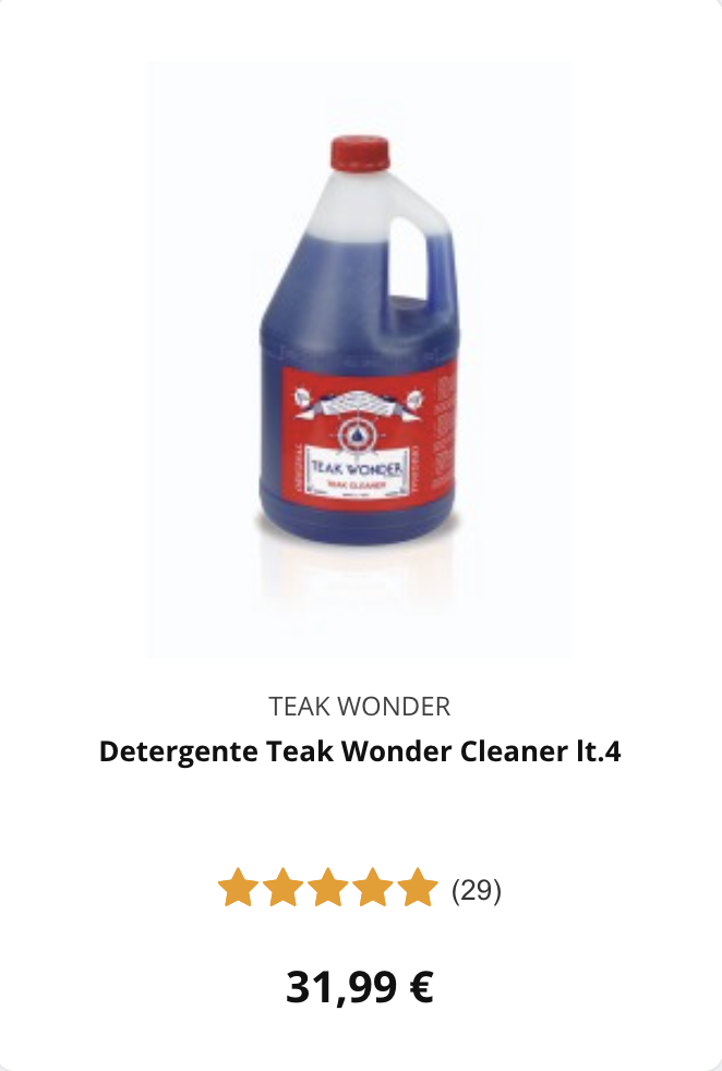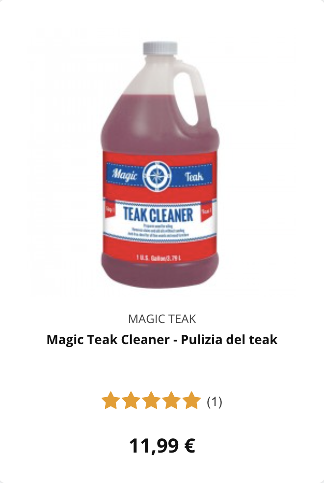| Risciacqua con acqua dolce per eliminare sale, sabbia e residui. Pulisci con un detergente specifico, seguendo fibre e scanalature. Sciacqua di nuovo con cura per rimuovere ogni traccia di prodotto. Proteggi il teak con il trattamento più adatto, naturale o sintetico. Lascia asciugare e controlla eventuali punti da ritoccare.