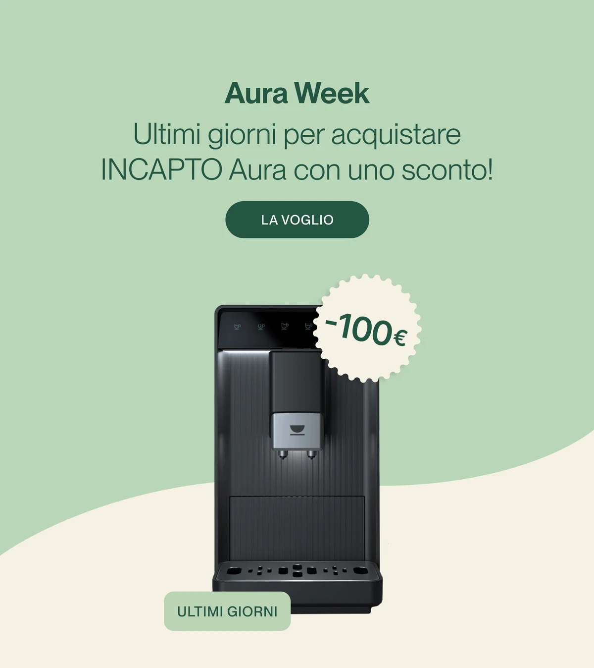La nostra Aura Week sta per finire, ma sei ancora in tempo per aggiudicarti una macchina da caffè superautomatica INCAPTO Aura con uno sconto di 100 €.