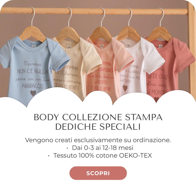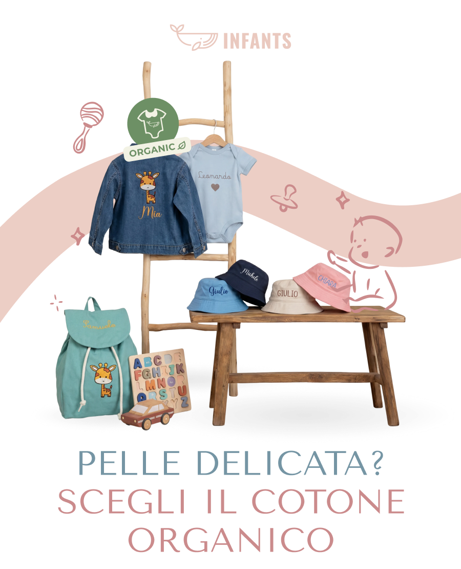 sai qual è la cosa più morbida che il tuo bambino possa indossare? Un tessuto che non ha nulla da nascondere, perché sulla pelle dei bambini non si scende a compromessi. La nostra Linea Organica nasce proprio da qui: cotone organico certificato, coltivato senza pesticidi né sostanze chimiche, che accarezza la pelle del tuo bambino senza irritarla. Leggero, traspirante, pensato per essere indossato tutto il giorno, dalla mattina alla nanna. Nella Linea Organica trovi body, t-shirt, pigiamini, zainetti e tanti altri articoli, tutti personalizzabili con il nome, un design o una dedica speciale.