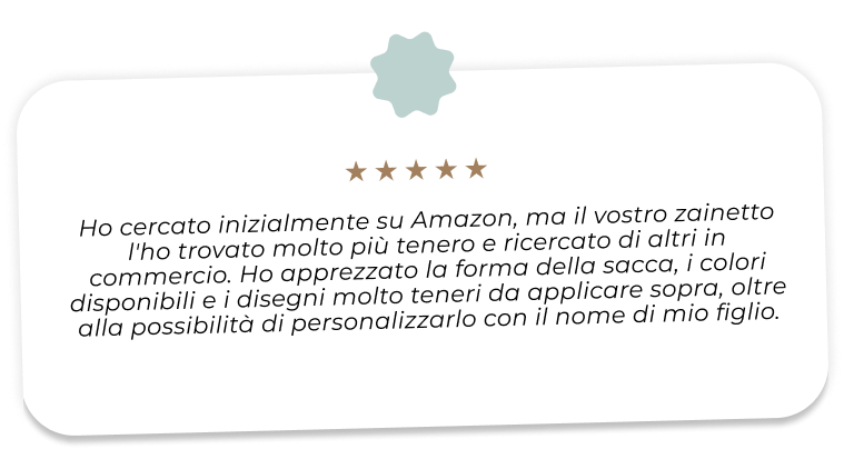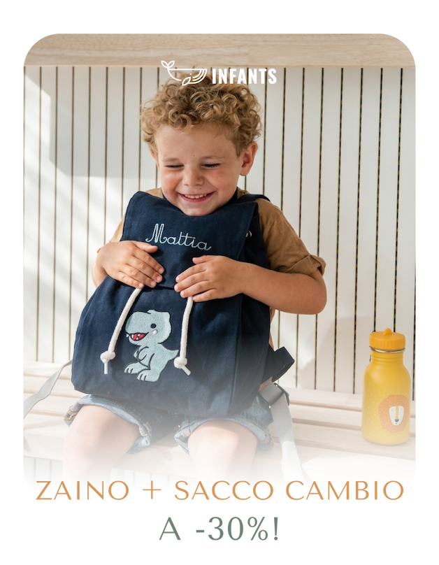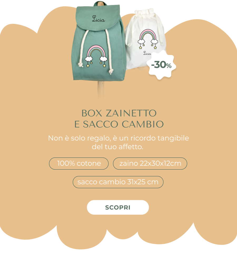 Non è uno zaino qualsiasi che trovi ovunque. È fatto in cotone biologico certificato, ricamato nel nostro laboratorio su ordinazione. Il sacco cambio ha lo stesso design stampato con colori a base d'acqua, sicuri per la pelle dei bambini. Lo scegli tu: il colore dello zaino, il disegno che gli piace, il suo nome. E quando lo ricevi, è già pronto per accompagnarlo nelle sue avventure. Non aspettare l'ultimo momento: ordina ora risparmiando il 30%, e quando arriva la bella stagione sei già organizzata!