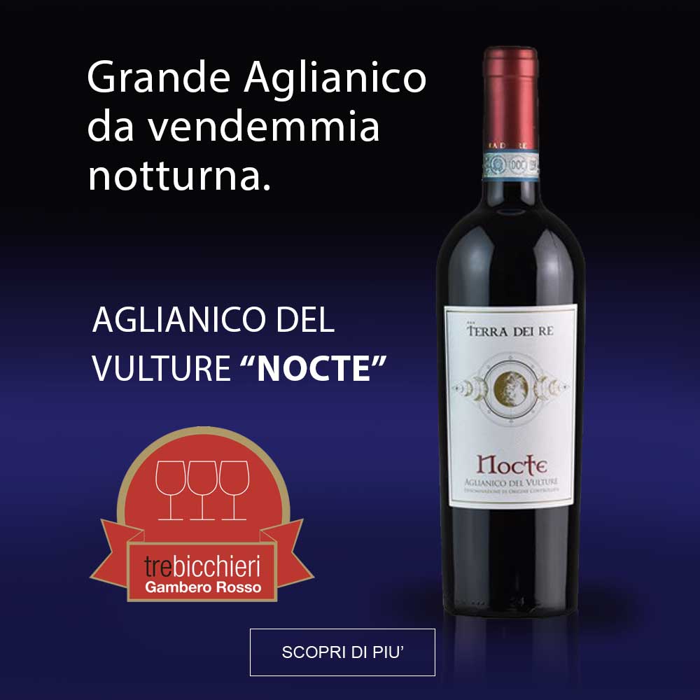 L'Aglianico del Vulture "NOCTE" è la punta di diamante dell'Azienda vinicola Terra dei Re. Viene vendemmiato di notte esattamente durante "l'estate di S.Martino" poichè nell’emisfero boreale si verificano delle condizioni climatiche molto particolari, soprattutto escursioni termiche molto evidenti che favoriscono maggiori aromaticità al vino. Questa tipologia di vendemmia viene analizzata ogni anno e le differenza aromatica dell'uva raccolta di notte dona al vino una predominanza aromatica completamente differente da quella fatta di giorno. Un abbraccio esuberante tra morbidezza e intensità, tannini di raffinata eleganza si fondono con spezie intriganti. La rosa appassita e la viola gli donano il finale vellutato.