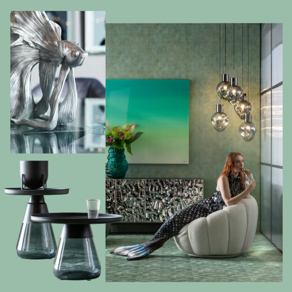 Nell'arredamento si esprime con fredde sfumature sul blù rispecchiando i colori del mare, cromo scintillante e moderni materiali.