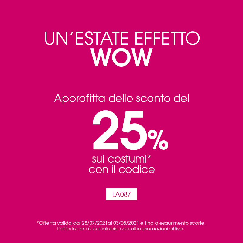 *L'offerta è valida fino al 03/08/2021 e fino a esaurimento scorte. Per ottenere lo sconto del 25% su tutti i costumi e la spedizione standard gratis utilizza all'interno del carrello il codice promozionale LA087.