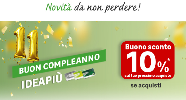 *La Promozione è valida esclusivamente per acquisti effettuati presso i punti vendita a insegna Leroy Merlin dislocati sull’intero territorio nazionale, online su leroymerlin.it e con vendita telefonica dal 20/07/2022 al 10/10/2022 (il Periodo Promozionale) previa presentazione di IDEAPIÙ EASY, IDEAPIÙ PREMIUM e IDEAPIÙ PROFESSIONAL (IDEAPIÙ) in corso di validità. La promozione dà diritto ad un buono sconto del 10% (“Il Buono”/ “I Buoni”) fino ad un massimo di 5 Buoni, per ogni scontrino effettuato in giorni diversi e contenente almeno uno dei prodotti selezionati Vimar, Grohe, Samsung, ABC San Marco e Black&Decker indicati nel regolamento completo https://leroymerlin-res.cloudinary.com/image/upload/v1657544653/Disclaimer_Regolamento_Compleanno_IdeaPi%C3%B9_2022.pdf, per gli acquisti effettuati dal Titolare e Co-titolare IDEAPIÙ, al netto dei resi. I Buoni sconto saranno disponibili dopo 48 ore dagli acquisti effettuati ed avranno validità di tre mesi dalla data di emissione. Consulta il regolamento completo nei punti vendita Leroy Merlin aderenti e sul sito www.leroymerin.it/documentazione-regolamenti.