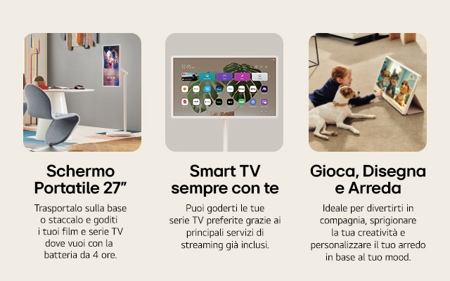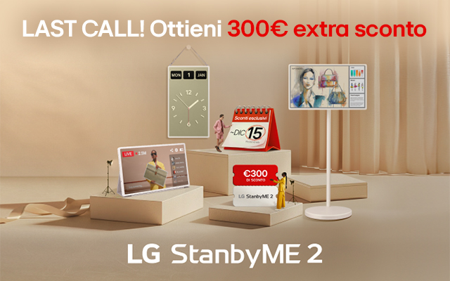 * Iniziativa promozionale valida solo per Clienti Member LG dal 26/11/2025 al 15/12/2025. Sconto al Checkout di 300€ valido solo sullo StanbyME 2 27LX6TDGA. Sconto non cumulabile con altre promozioni in corso. Sconto non applicabile agli utenti Vip Program. |