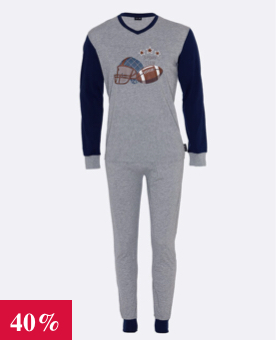 Pigiama lungo in cotone jersey, grigio melange stampa rugby