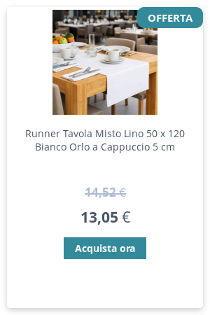 | | | Runner Tavola Misto Lino 50x120 cm Colore Bianco – Orlo cappuccio Prezzo a € 10,70 + iva anziché 11,90 + iva | | |