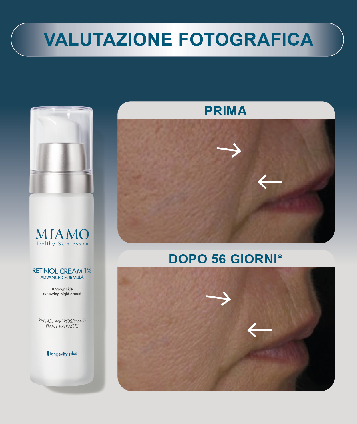 *In vivo: studio clinico sotto controllo dermatologico condotto su 20 volontarie di età compresa tra i 45 e i 60 anni con pelle da normale a mista. Il prodotto è stato applicato sul viso una volta al giorno per 56 giorni.
