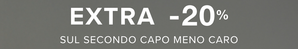 Lo sconto EXTRA del 20% viene applicato sul secondo capo meno caro e sarà visibile direttamente nel carrello, nel riepilogo dell’ordine. La promozione è valida solo per pochi giorni.
