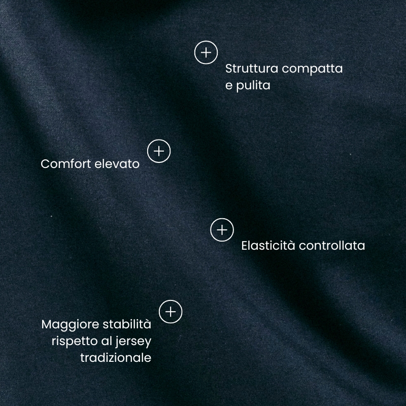 Questo tessuto cambia il modo di usare il jersey. Non solo felpe e t-shirt. Anche blazer, bomber e pantaloni dalla linea più definita.