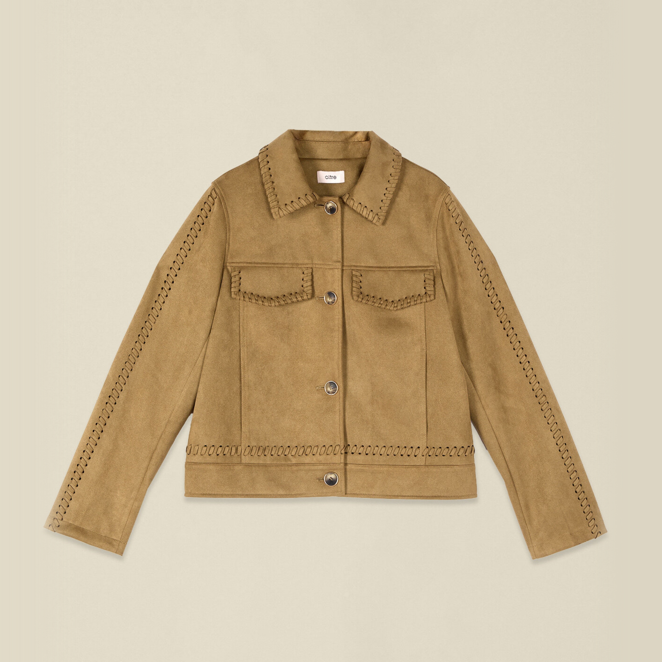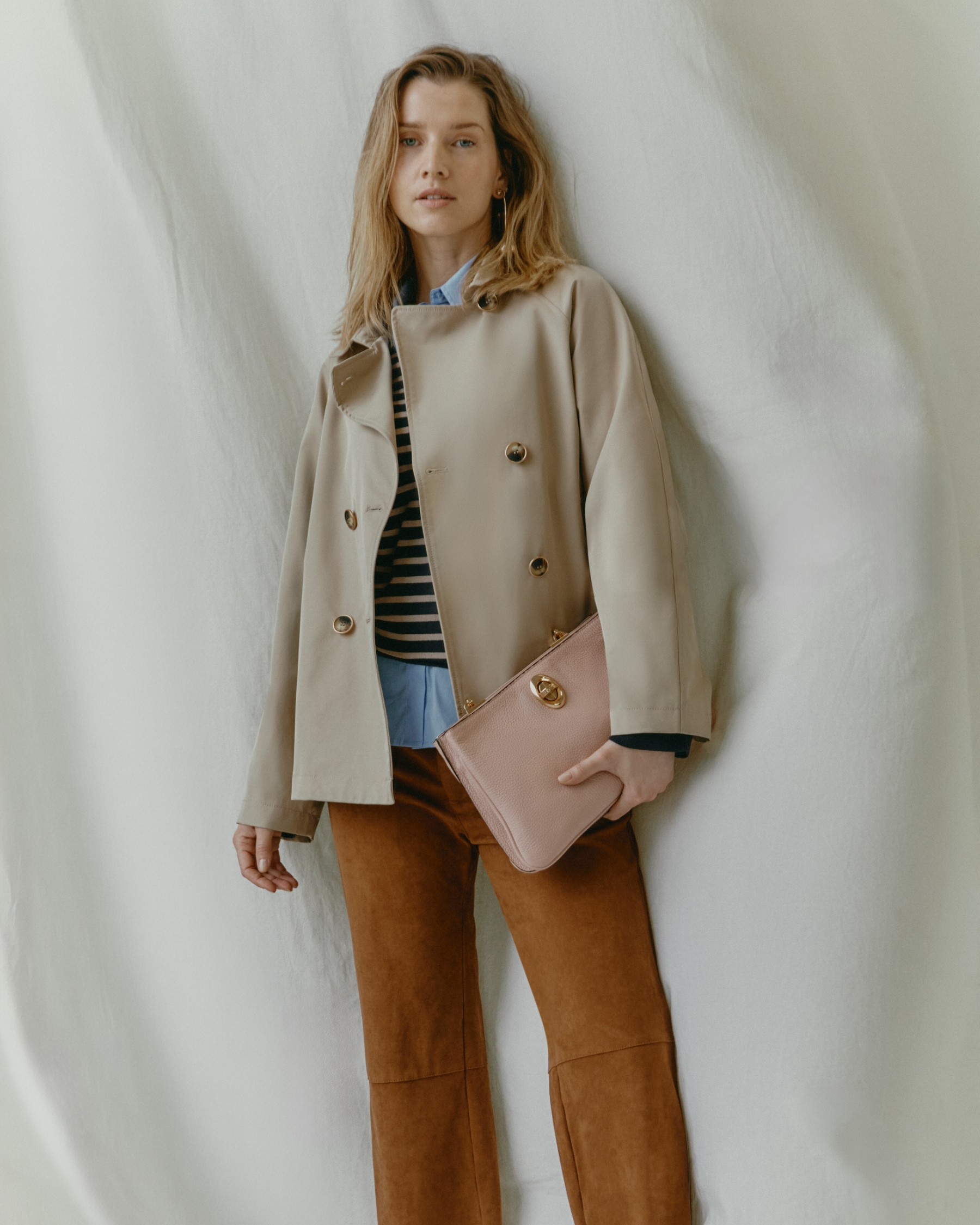 Le sfumature della terra incontrano l’azzurro in un mix elegante e contemporaneo. Texture ricercate valorizzano pantaloni, camicie, blazer e trench, mentre le giacche effetto suede si affermano come protagoniste di stagione.