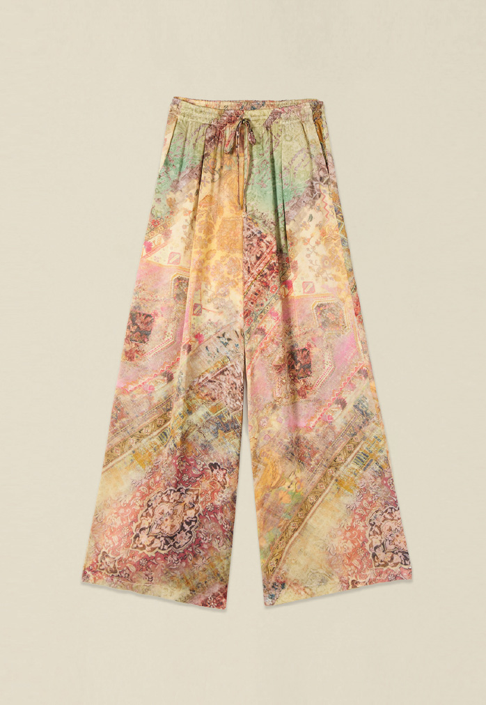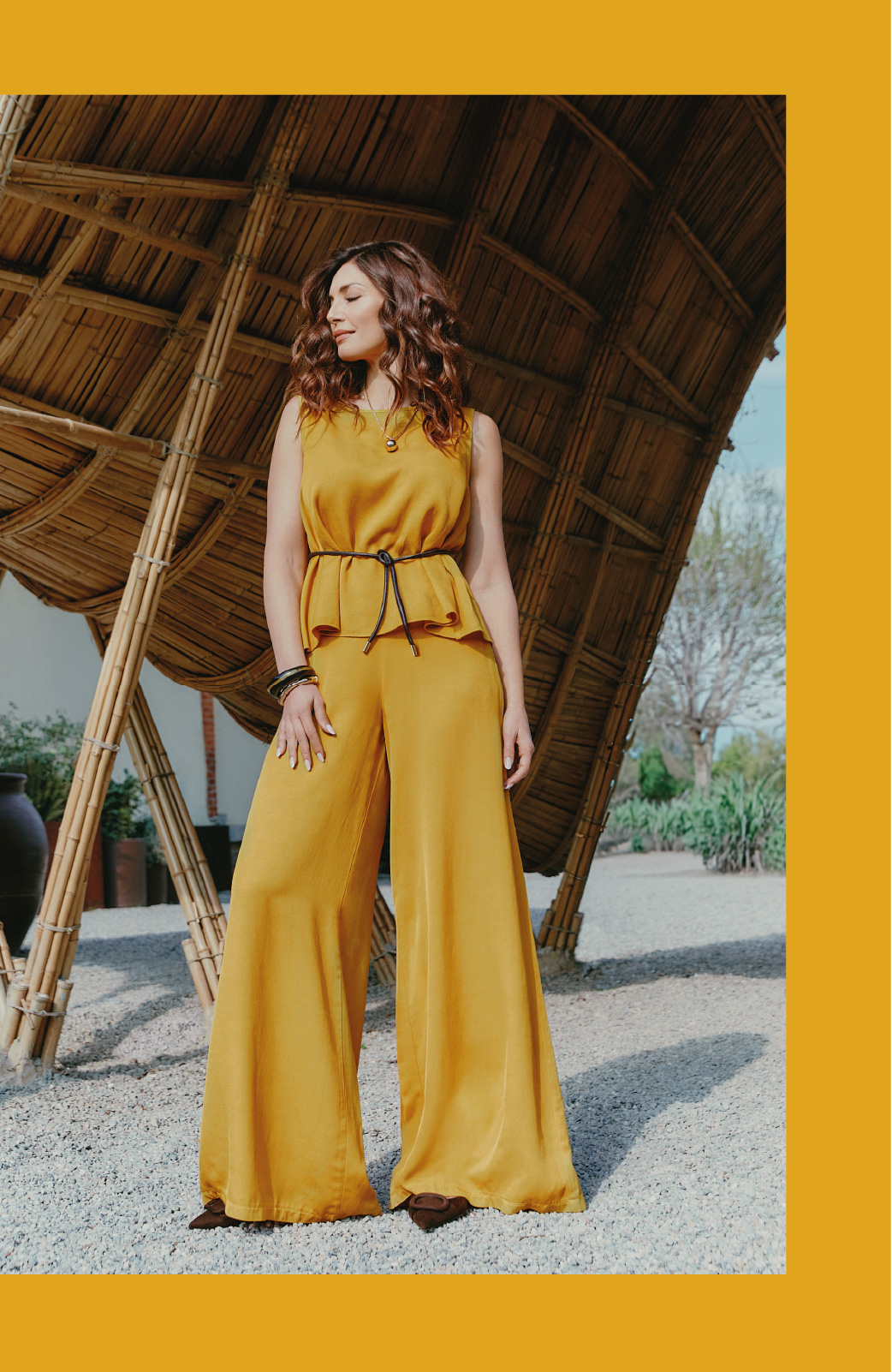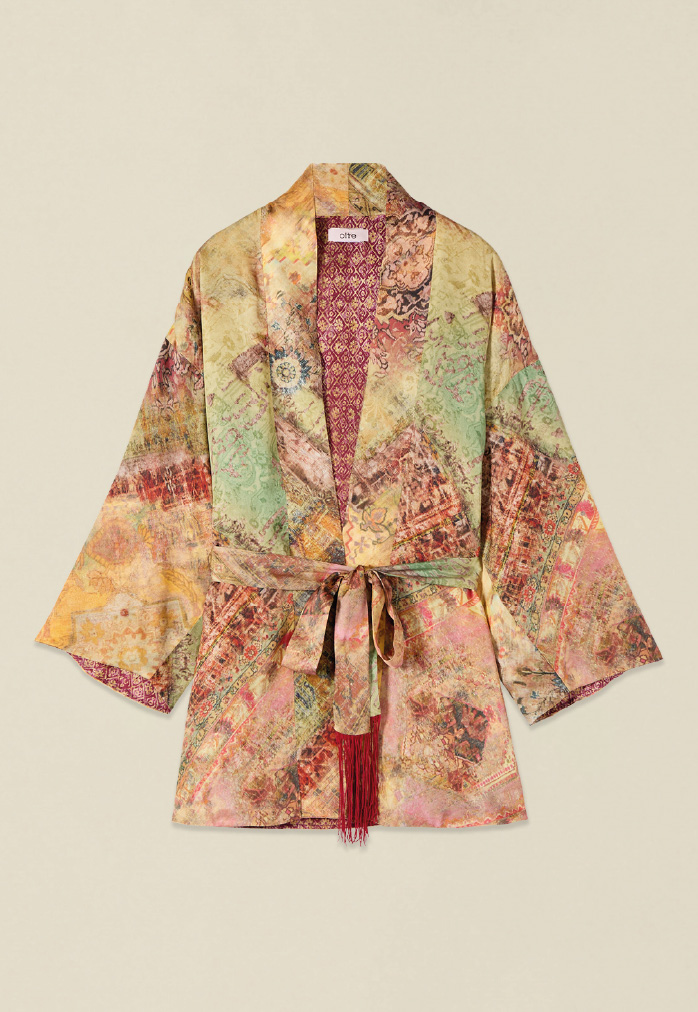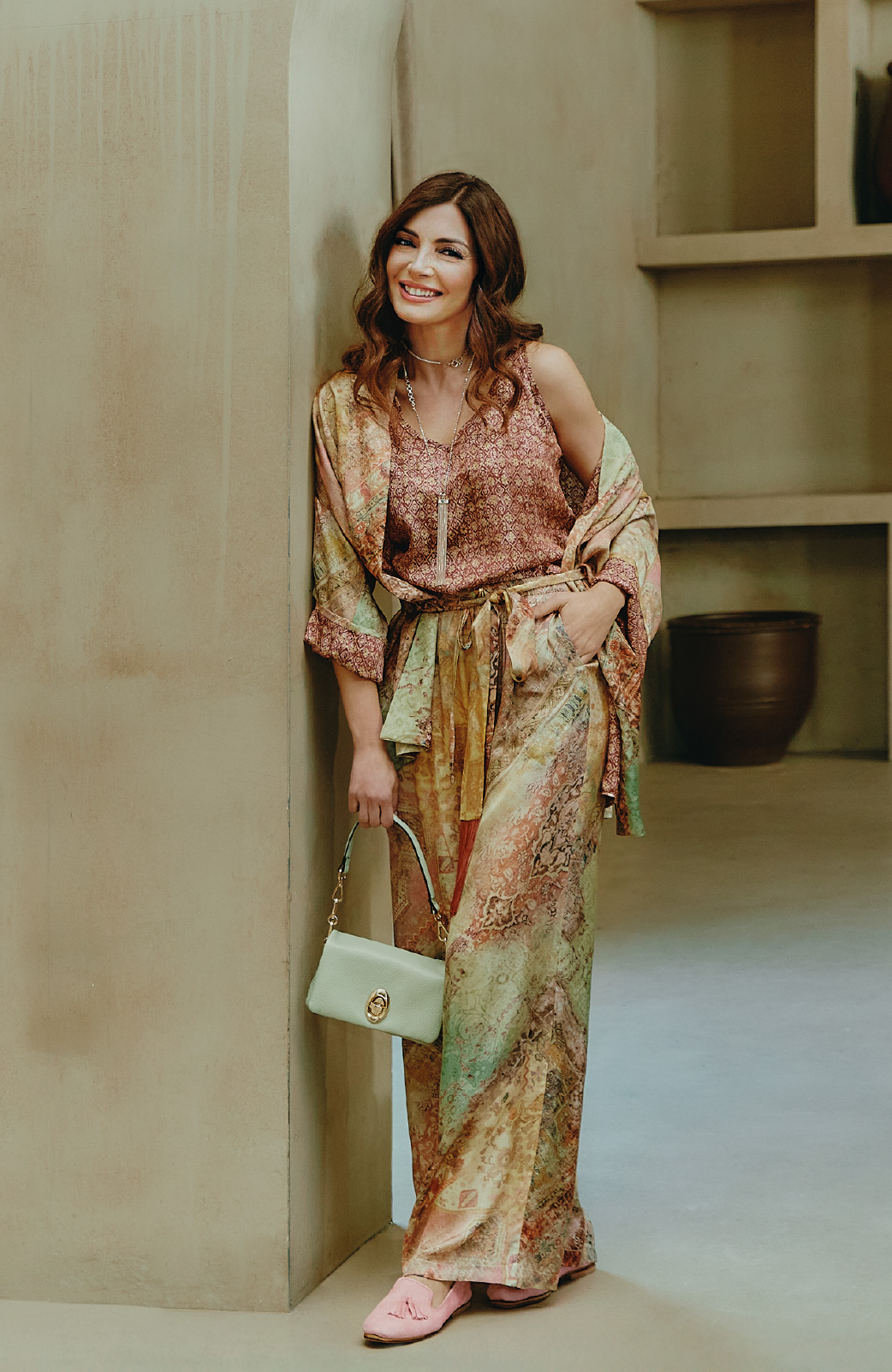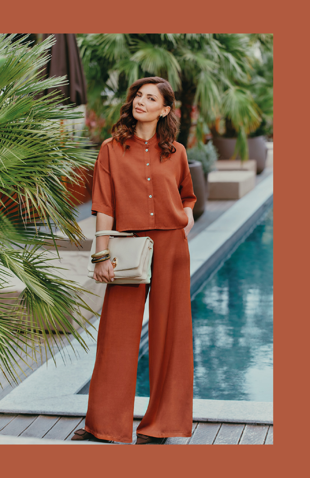 I look terracotta e ocra, in lino-viscosa, valorizzano la silhouette con leggerezza, mentre il completo kimono conquista con la sua fluidità e la stampa dalle fresche nuances primaverili.
